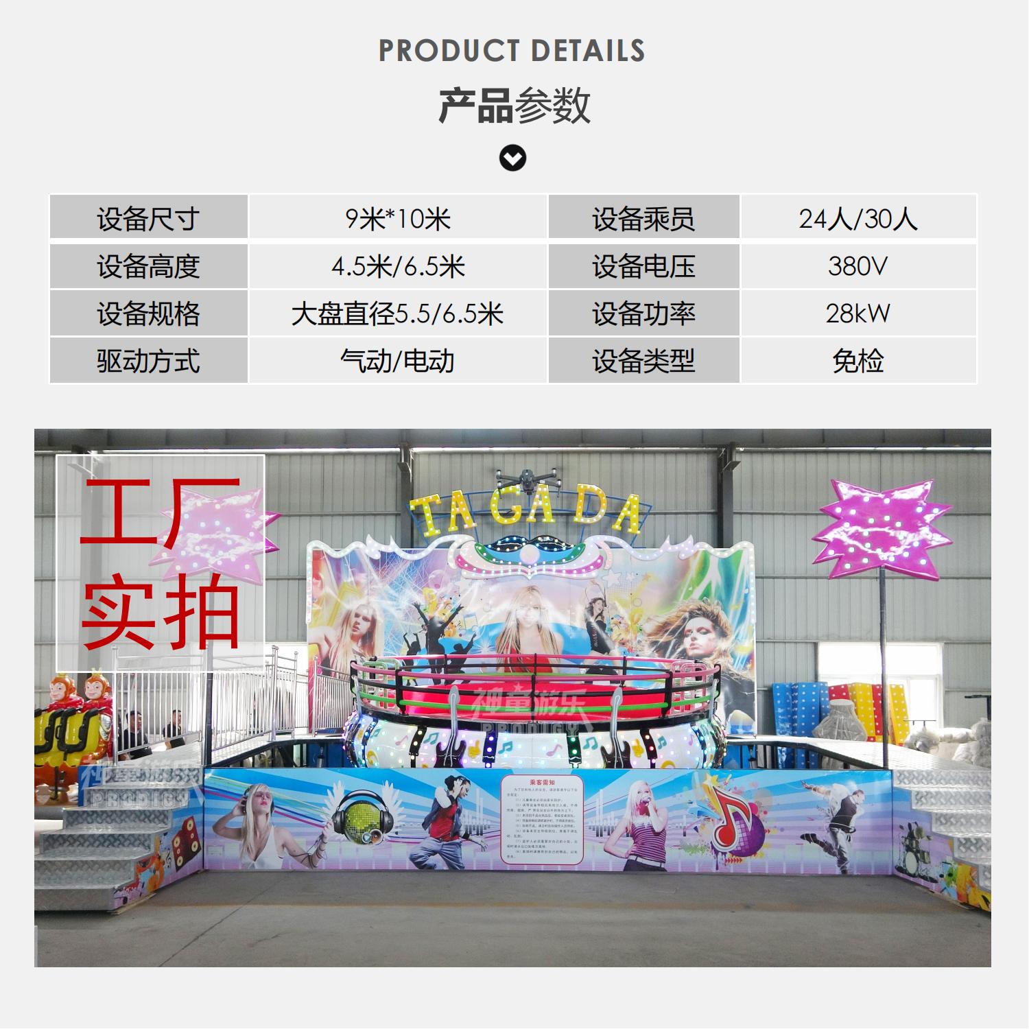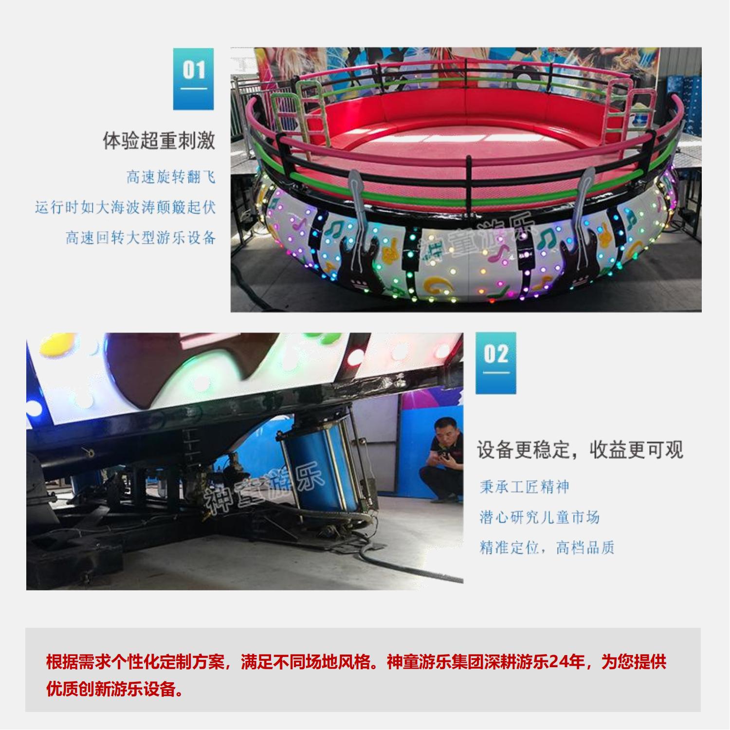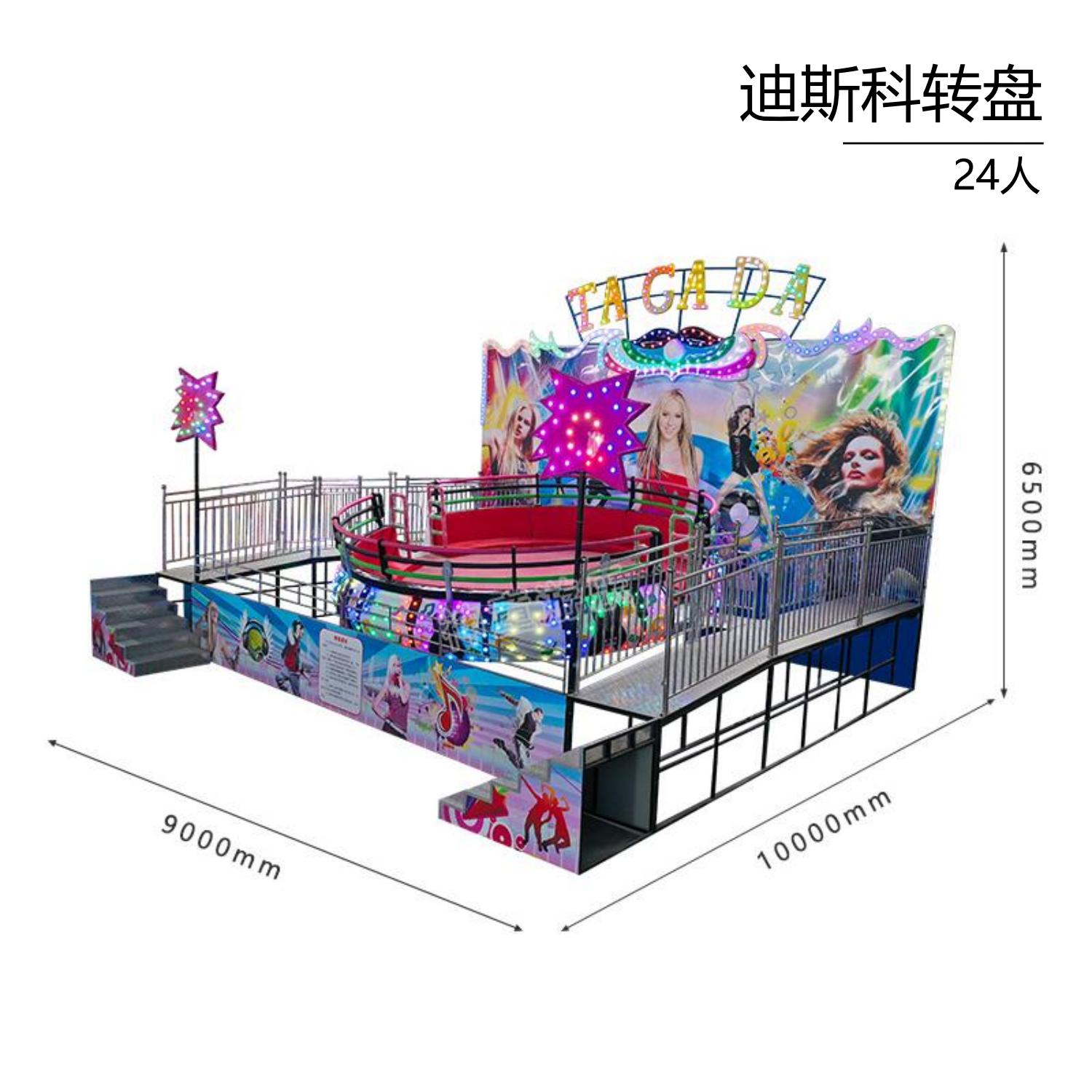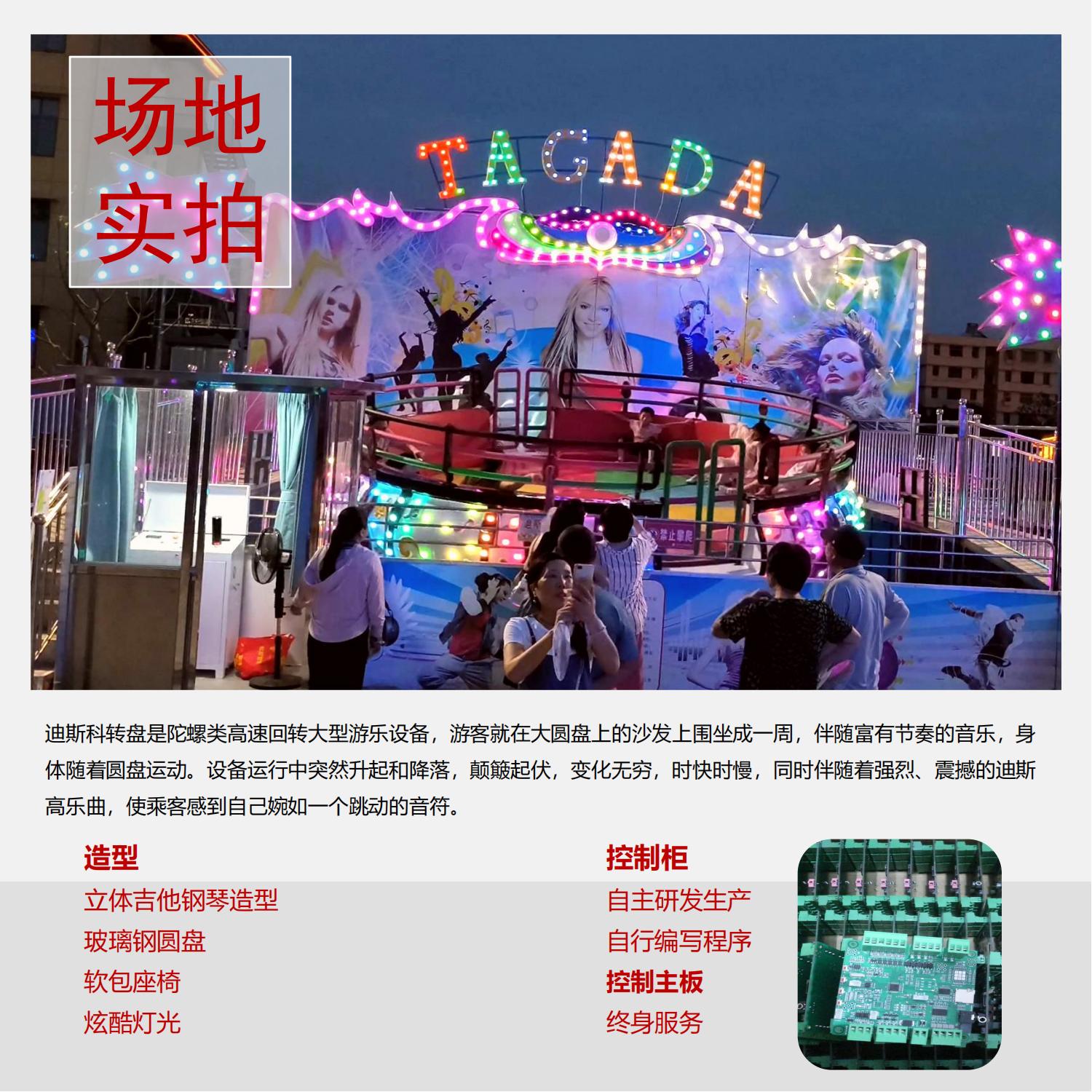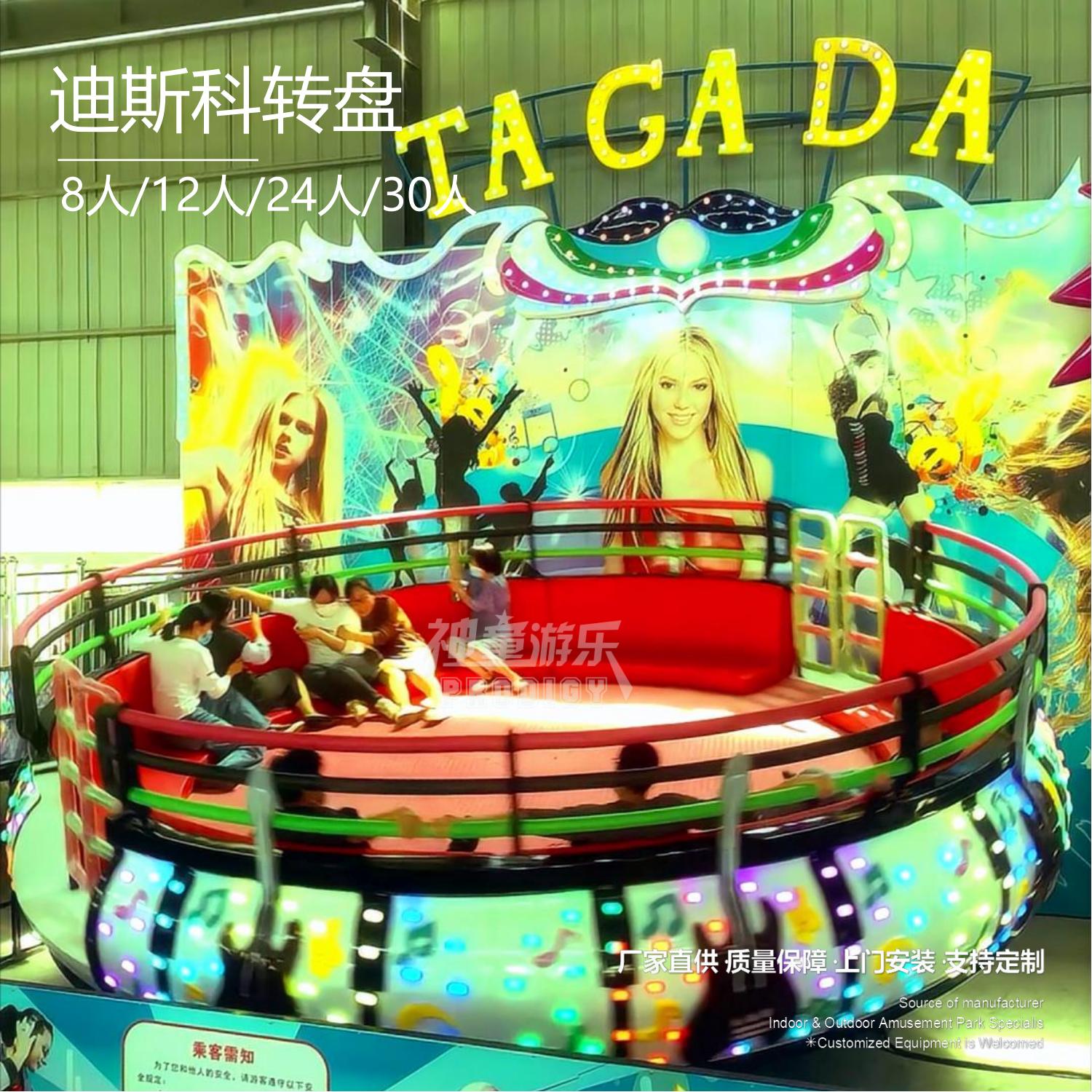 迪斯科轉盤是陀螺類高速回轉大型游樂設備,游客就在大圓盤上的沙發上圍坐成一周,伴隨富有節奏的音樂,身體隨著圓盤運動。設備運行中突然升起和降落,顛筋起伏,變化無窮,時快時慢,同時伴隨著強烈、震撼的迪斯高樂曲,使乘客感到自己婉如一個跳動的音符。